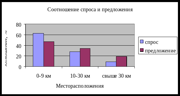 Рис. 2.1 Соотношение предложения и спроса в зависимости от расстояния до Екатеринбурга.