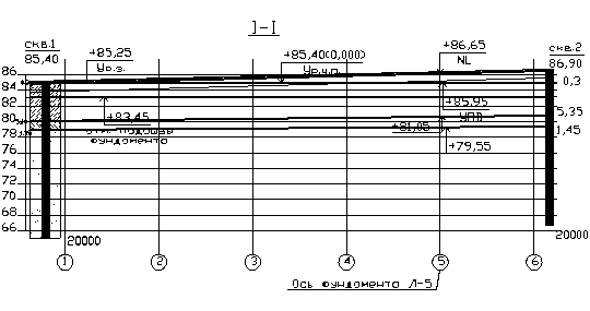 Инженерно-геологический разрез I-I с посадкой здания и фундаментов на естественном основании