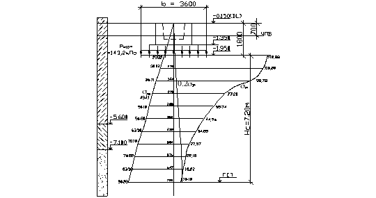 Граница распределительной подушки и верхнего слоя суглинка условна смещена до глубины zi = 0,96 м. от подошвы фундамента (фактическое положение на глубине z = 0,90 м.), граница верхнего и среднего слоев – до глубины zi = 3,84 м. (фактическое положение на глубине z = 3,8 м.), а граница суглинка и глины смещена до глубины zi = 5,23 м. от подошвы (фактическое положение на глубине z = 5,3). На глубине Hc = 6,72 м. от подошвы фундамента выполняется условие СНиП 2.02.01–83* (прил. 2, п.6) ограничения глубины сжимаемой толщи основания (ГСТ):