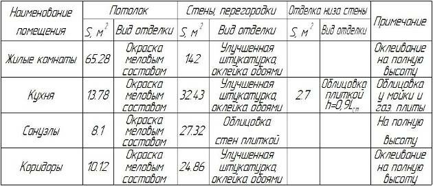 Внутренняя отделка: штукатурка потолков, оклейка стен обоями, в санузлах и на кухне – глазурованные плитки.