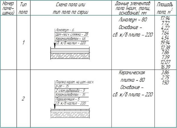 В зависимости от назначения помещений и расположения их по этажам, используются следующие конструкции полов: