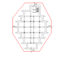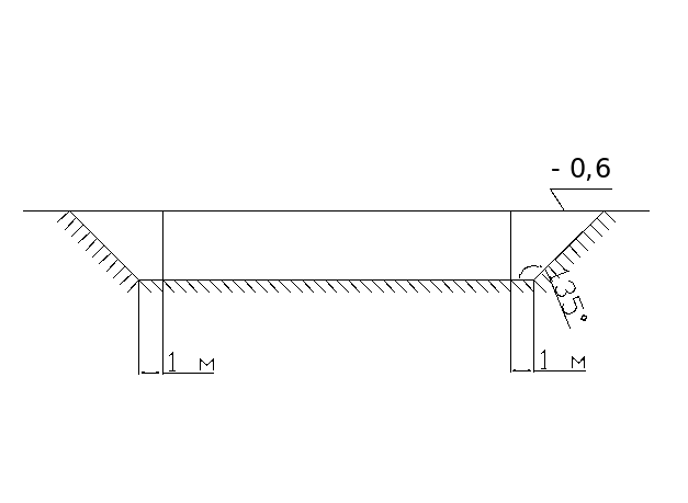 Учитывая сложную конфигурацию наружных стен, экскаватором отрывается котлован не по периметру стен, с откосом в 1 метр, по схеме показанной на рисунке 1. Тем самым можно упростить, а следовательно, удешевить работу по устройству нулевого цикла.