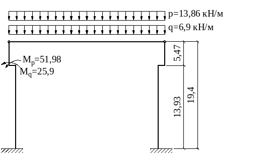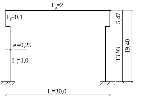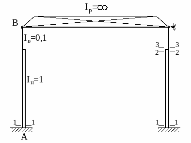 Учитывая симметрию рамы и нагрузки, пренебрегаем горизонтальным смещением верхних узлов рамы.
