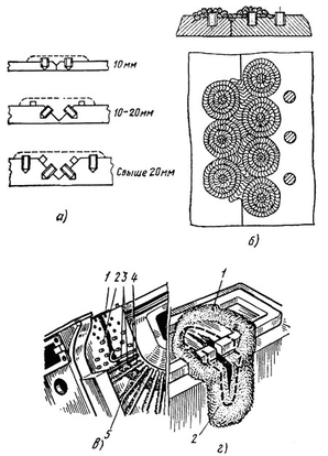 Рис. 1.3.1. Сварка чугуна с применением стальных шпилек: а - установка шпилек при V-образной подготовке кромок; б - обварка шпилек;