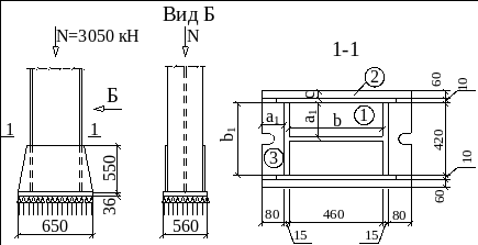 Участок 3 работает так же, как консольный, так как отношение сторон 420/80=5,25>2. Свес консоли на 20 мм больше, чем на участке 2 для размещения анкерных болтов.