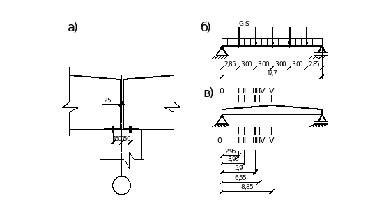 Рисунок 2. Расчетная схема балки и расположение сечений: а – расположение анкерных болтов; б – схема загружения балки; в – расположение расчетных сечений