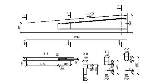 Сечения 0-0, I-I, III-III и V-V рассматриваются при оценке трещиностойкости и жесткости балки в стадии эксплуатации;, сечение II-II – для оценки прочности и трещиностойкости в стадии изготовления и монтажа; IV-IV – для подбора продольной арматуры балки.