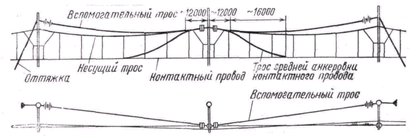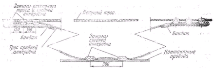 При компенсированной цепной подвеске среднюю анкеровку выполняют в двух пролетах (рис. 4.1, б) Контактный провод крепят к несущему тросу в обоих пролетах, применяя наклонные отрезки сталемедного троса сечением 50 мм2. Среднюю анкеровку несущего троса производит на опоры с оттяжками вспомогательным тросом (сталемедный трос сечением 70 мм2). На средней опоре основной и вспомогательным тросы крепят в общем седле.