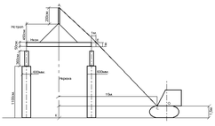 Проводят прямую линию (ось стрелы крана) через точки АЕ до пересечения в точке С с горизонтальной линией, проведенной на высоте шарнира стрелы крана, т.е. на расстоянии 1,5м. выше уровня его стоянки. Отрезок АС будет равен длине стрелы, но только при условии, что Н полисп. = 2м. Вылет стрелы (L стрелы) определяют замером расстояния ОК на чертеже.