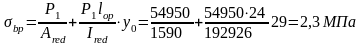 Вычислим сжимающее напряжение в бетоне на уровне центра тяжести напрягаемой арматуры от усилия обжатия Р1 и с учетом изгибающего момента от веса плиты