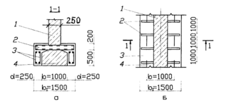 Усиление ленточного фундамента: а – сечение 1-1; б – фрагмент плана усиленного фундамента; 1 – кирпичная стена; 2 – траверса из двух швеллеров; 3 – каркасы дополнительных фундаментных полос из бетона; 4 – существующий фундамент