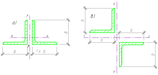 Рисунок 13. Сечения элементов легких ферм – равнополочные уголки (б – стержень 6-7, а- остальные стержни фермы)
