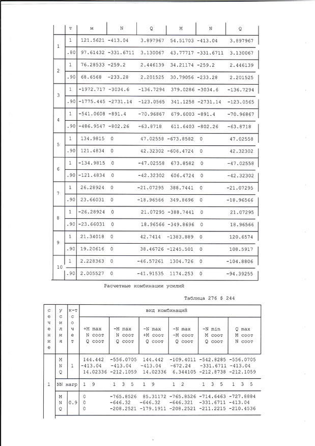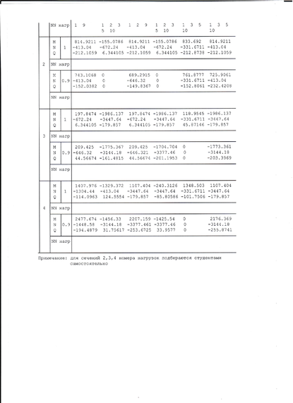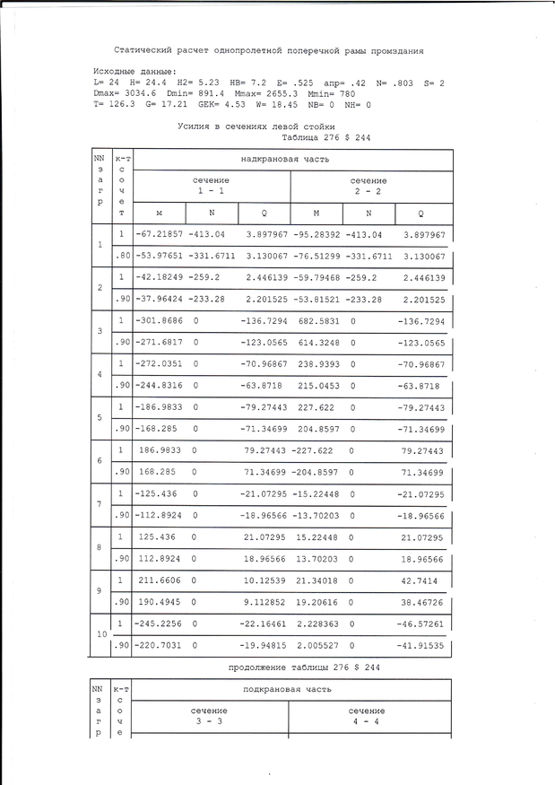H20=20 м Расчетная сосредоточенная сила для активного давления (случай при H0>H20 или при H20>Hкр): W=(ωm23.4+ωm26.88)*γf*В*Нш/2, где γf =1.4 – коэффициент надежности по ветровой нагрузке, ωm23.4=ω0*k23.4*c=0.3*1.292*0.8=0.310 кН/м2 – давление ветра на отметке низа фермы H0=23.4 м, ωm26.88=ω0*k26.88*c=0.3*1.338*0.8=0.321 кН/м2 – давление ветра на отметке верха кровли Hкр=26.88 м, Нш=Hкр-H0=26.88-23.4=3.48 м – высота шатра. W=(0.310+0.321)*1.4*12*3.48/2=18.45 кН. Расчетная сосредоточенная сила для отсоса: W’=0.75*W=0.75*18.45=13.84 кН. Определим расчетные усилия в характерных сечениях элементов рамы (1-1, 2-2, 3-3, 4-4 рисунок 10), которые необходимы для подбора сечения элементов и для расчета сопряжений и узлов. Принимаем: e=0.5*(bн-bв)=0.5*(1750-700)=525 мм. На данном этапе сечения стоек и ригеля неизвестны, поэтому зададимся отношением жесткостей элементов рамы из условий (здесь q=gкрн+sgн=2.56+1.8*0,7=3.82 кН/м2): примем IB/IH=0.1, IP/IH=2, тогда IB=1, IH=10, IP=20. Расчетная схема изображена на рисунке 10. Коэффициент пространственной работы каркаса пр зависит от типа кровли. При жестких кровлях из ж/б плит с замоноличиванием швов пр находится по формуле: где mр – число рам в блоке, β=2*n0/Σyi=2*8/9=1.78 – коэффициент, учитывающий разгружающее влияние смежных рам по отношению к рассматриваемой (2*n0 – общее число колес у двух сближенных кранов на одном пути). αпр=1.78*[1/11+962/(2*(1192+962+722+482+242))]=0.42. Статический расчет рамы произведен на ЭВМ с помощью программы «Statik». № загружений в программе: 1 – G (постоянная), 2 – P(S) (снеговая), 3 – Mmax (момент от крана у левой колонны), 4 – Mmin (момент от крана у правой колонны), 5 – T (торможение тележки крана у левой колонны слева направо), 6 – T (торможение тележки крана у левой колонны справа налево), 7 – T (торможение тележки крана у правой колонны слева направо), 8 – T (торможение тележки крана у правой колонны справа налево), 9 – W (ветер слева направо), 10 – W (ветер справа налево). Определим неизвестные величины для расчета программы: K=1, так как сопряжение ригеля с колонной жесткое, N=0,9*gнкр/gкр=0,9*2.56/2.87=0.80, S=B/Bф=2, NB=0, NH=0 – нагрузка от стеновых панелей. Исходные данные для выполнения расчета занесены в таблицу 2. Величина L H H2 Hв Iн Iв Iр E АПР K N S Размерность м м м м - - - м - - - - Значение 24 24.4 5.23 7.2 10 1 20 0.525 0.42 1 0.80 2 Величина Dmax Dmin Mmax Mmin G P(S) T GEK(ωв) W GEK1 (ωв’) W1 NB NH Размерность кН кН кН*м кН*м кН/м кН/м кН кН/м кН кН/м кН кН кН Значение 3034.6 891.4 2655.3 780.0 17.21 10.8 126.3 4.53 18.45 3.39 13.84 0 0 Стропильную ферму проектируем на основе серии I.460.2-10/88 «Стальные конструкции покрытий одноэтажных производственных зданий с фермами из парных уголков». Схема стропильной фермы представлена на рисунке 12. Нагрузки от собственной массы 1 м2 кровли определяются по фактическому составу с учётом собственной массы стропильных ферм и связей (см. таблицу 1). Сосредоточенные силы от постоянной нагрузки на узлы верхнего пояса фермы (d – шаг узлов): Р=g*d. Р=17.21*3=51.62 кН. Сосредоточенные силы от снеговой нагрузки на узлы верхнего пояса фермы для бесфонарного здания во всех узлах одинаковы и равны: Рс=S*d. Рс=10.8*3=32.4 кН. В опорных сечениях ферм, являющихся ригелями рам с жесткими узлами, возникают изгибающие моменты. Для выявления дополнительных усилий в раскосах и приопорной панели верхнего пояса рассматриваются – Млевmax и соответствующий момент на правой опоре – Мпрсоот, вычисляемый для тех же нагрузок. Mлевmax принимаем по таблице расчетных комбинаций усилий для колонны левого ряда (из условия равновесия узла сопряжения ригеля со стойкой). Для опред