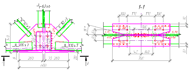 Для фермы пролетом 24 м рассчитывают два узла укрупнительного стыка – верхний и нижний. Стык поясов осуществляем с помощью листовых накладок. Размеры сечения горизонтальных накладок и фасонки подбираем из условия их равнопрочности с перекрываемыми вертикальными и горизонтальными полками пояса.