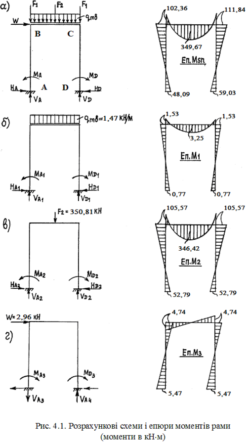 Складуючи значення зусиль у відповідному перерізі за трьома схемами завантаження і враховуючи сили F1 = 231,21 кН, отримаємо для вихідної розрахункової схеми рами такі зусилля: