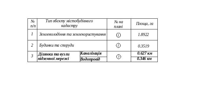 У зв'язку зі створенням державного містобудівного кадастру однією з основних проблем є розробка його структури, змісту, систем класифікації й кодування кадастрової інформації. Тож перед нами була поставлена задача по виділенню об’єктів містобудівного кадастру. В результаті проведених робіт кожному об’єкту було присвоєно свій код. Всі об’єкти були об’єднані по окремим кодам згідно до використання та призначення кожного із них.