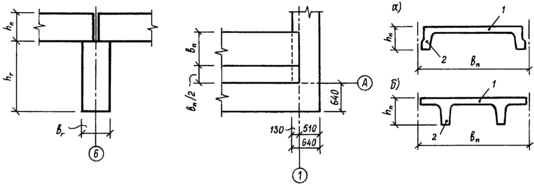 Выбор типа панелей производится на основе экономических и эксплуатационных критериев. В курсовой работе предлагается выбрать тип панели по собственному усмотрению и использовать рёбристые панели (рис.1.3, а), или панели типа "2Т" (рис.1.3, б). В данном примере расчёта применяются рёбристые панели перекрытия. Рекомендуемые размеры сечения и нагрузка от собственного веса для различных типов панелей представлены в Приложении 1.