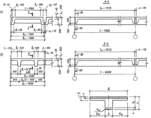 Поперечное и продольное сечение рёбристой панели (а) и панели типа "2Т" (б).