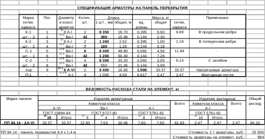 | Пролёт панели l, м | Размещение арматуры по длине сеток С-1 и С-2, мм | Общая длина стержня, мм | Размещение арматуры по ширине сетки С-1, мм | Общая длина стержня, мм |