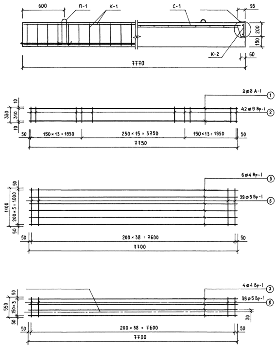 Длина стержней продольной арматуры на 20 мм меньше конструктивной длины панели lk = 7770 мм: