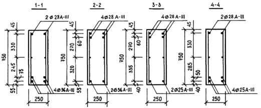 Под действием реактивного давления грунта psf ступени фундамента работают на изгиб как консольные элементы (см. рис.6.1). Растягивающие усилия воспринимает продольная арматура, расположенная возле подошвы фундамента. Подбор продольной арматуры производится для сечений, проходящих по грани средней ступени (1-1), по грани верхней ступени (2-2) и по грани колонны (3-3).