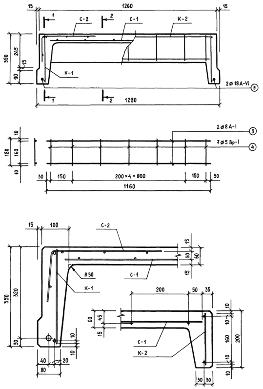 | Пролёт панели l, м | Размещение арматуры по длине каркаса К-2, мм | Общая длина стержня, мм | Размещение арматуры по высоте каркаса К-1, мм | Общая длина стержня, мм |