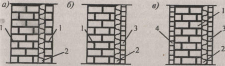 Наружные стены выполняют в виде трех основных конструктивных схем: массив или сплошная кладка на всю толщину стены; кладка с утеплителем в теле стены (рисунок 2, а) и кладка с утеплителем на поверхности стены (рисунок 2,б и в). Массив — наиболее распространенная форма наружных стен кирпичом заполняется все сечение стены. Согласно последним нормативным требованиям, для обеспечения требуемой теплозащиты толщина стены из кирпича для климатического пояса Москвы должна быть более 100 см. Такое значительное потребление кирпича приводит к удорожанию конструкций, увеличению трудоемкости и продолжительности строительства.