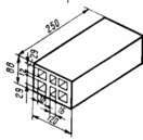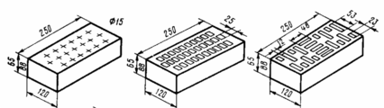 Улучшение теплотехнических свойств кирпича достигается за счет образования отверстий (пустот). Кирпич пустотелый (рисунок 3) с круглыми или прямоугольными пустотами, вертикально расположенный по отношению к постели, выпускают девяти видов с количеством пустот 2…60 и пустотностью 10…33%. Кирпич с горизонтальным расположением пустот производят трёх видов с четырьмя или шестью сквозными прямоугольными отверстиями в один или два ряда и пустотностью 41…42%. [8]
