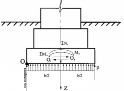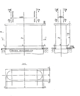 I слой: суглинок – толщина слоя 4.7м; по степени влажности суглинок относится к насыщенные водой (0.5 II слой: песок средней крупности – толщина слоя 3.6м; по степени влажности относится к насыщенной водой; по коэффициенту пористости относится к средней плотности; E=42 МПа; условное расчетное сопротивление R0=343 кПа. III слой :глина - по числу пластичности Ip=0.19 – глина; по показателю текучести находится в полутвердом состоянии (0 Заключение по данным геологического разреза: природный рельеф площадки спокойный с горизонтальным залеганием пластов грунта. II и III слои грунтов могут служить основанием для фундамента. Выбор возможных вариантов фундаментов: в качестве возможных вариантов фундамента принимаем: - фундамент мелкого заложения; - свайный фундамент на забивных призматических сваях. 1.3 Сбор нагрузок, действующих на фундамент В соответствии с [2, п. 2.1*] установлено 18 видов постоянных и временных нагрузок, которые могут действовать на конструкции мостов и, следовательно, передаваться на опору. На рисунке 1. показаны следующие основные нагрузки: вертикальные нагрузки - масса пролетных строений Рп, являющаяся суммарной равнодействующей сил Рп/2, соответствующих давлению от примыкающих к данной опоре двух пролетных строений; сила воздействия на опору Ртр от временной подвижной вертикальной нагрузки, являющаяся равнодействующей сил Ртр/2, полученных от загрузки примыкающих к опоре пролетов; масса опоры Ро - собственная масса надфундаментной части опоры. горизонтальная нагрузка - горизонтальная составляющая Т силы воздействия на опору Ртр от временной подвижной вертикальной нагрузки. Рисунок 1. – Опора моста с действующими нагрузками Таблица 2. Нагрузки, действующие на фундамент Наименование нагрузки Условное обозначение Ед. изм. Выражение для определения Кол-во Масса пролетных строений Рп кН 1350 Сила воздействия от временной вертикальной подвижной нагрузки Ртр кН 6075 Горизонтальная сила Т кН 750 Вес опоры моста Ро кН 373.5 2. Проектирование фундамента мелкого заложения на естественном основании 2.1 Определение глубины заложения подошвы фундамента. выбор отметки обреза фундамента 2.1.1 Определение глубины заложения подошвы фундамента Нормативная глубина сезонного промерзания определяется по формуле: dfn=do√Mt, где М, — коэффициент, численно равный сумме абсолютных значений среднемесячных отрицательных температур за зиму в данном климатическом районе; do - глубина промерзания (см), зависящая от вида грунта, принимается равной: песков средней крупности-23см. dfn=do√Mt=23*√42=149.06см=1.5м Расчетная глубина сезонного промерзания грунта определяется по формуле: df=khdfn , где kh, - коэффициент, учитывающий влияние теплового режима сооружения и принимаемый для отапливаемых зданий в зависимости от конструкций полов и температуры внутри помещений, а для наружных и внутренних фундаментов, неотапливаемых зданий ,kh = 1.1. df=khdfn=1.1*149.06=164.56см=1.6м 2.1.2 Выбор отметки обреза фундамента Обрез фундамента принимаем на 0.5м ниже горизонта самых низких вод 2.2 Определение площади подошвы фундамента и расчетного сопротивления основания Размеры обреза фундамента в плане принимаю больше размеров надфундаментной части опоры на величину с=0.2м в каждую сторону для компенсации возможных отклонений положения и размеров фундамента при разбивке и производстве работ (рис.1). Минимальная п