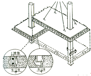 - после установки арматуры стыки панелей перекрытия бетонируются мелкозернистым бетоном В25 с фракцией не более 10мм, одновременно бетонируются и стыки надколонных панелей с колонной с предварительной установкой снизу опалубки в виде инвентарной обечайки;