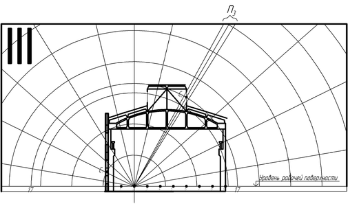 а) график III накладывается на чертеж поперечного разреза помещения, центр графика О совмещается с расчетной точкой 2, а нижняя линия графика III—со следом рабочей поверхности;
