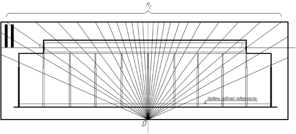 Чтобы определить расчетное значение КЕО при верхнем освещении необходимо подсчитать количество лучей n2 и n3 проходящих через световые проемы. Для определения количества лучей в выбранном масштабе вычерчивают продольный и поперечный разрез рассчитываемого цеха. На поперечный разрез наносится уровень условной рабочей поверхности, на котором отмечаются расчетные точки. Расчетные точки откладываются от стены, на которой расположены световые проемы до противоположной стены с выбранным шагом. Шаг принимается равным 1…2 метра в зависимости от точности, с которой требуется произвести расчет, для высокой точности шаг принимают равным 1 метр, при шаге 2 метра достигается минимальная точность.