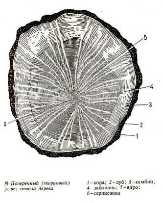 Во всяком дереве различают следующие основные части: крону (ветви с листьями), ствол и корни. Каждая из них выполняет определенные функции, необходимые для жизни дерева. Главную часть дерева и его основную массу (50-90% от объема) составляет ствол, являющийся основным сырьем для производства всех видов древесных строительных материалов. Изучая разрезы ствола дерева по трем направлениям - поперечному, проходящему перпендикулярно оси ствола; радиальному, проходящему вдоль ствола через его ось; тангенциальному, проходящему вдоль ствола по хорде поперечного сечения, - можно получить достаточно полное знакомство с макроструктурой древесины, хорошо видимой при небольшом увеличении или даже невооруженным глазом.