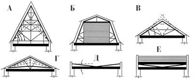 Рис.2 Форма крыш в различные исторические эпохи: А - романская архитектура, готика, Х-ХV вв. Уклоны скатов от 450 до 600. Барокко в северных регионах; Б - конец ХVI-XVII в. Развитое барокко во Франции. Крыши Монсара. Переменный уклон от 60 до 750, от 10 до 300; В - эпоха классицизма, конец ХVII-XVIII в. Начало XIX в. Ампир; Г - 30 - 40 гг. ХХ в. современность. Уклон от 10 до 300; Д - 50-е годы. ХХ в - современность. Уклон от 3 до 50; Е - начало ХХ века - современность. Уклон пола террасы до 30, гидроизоляции - 50.