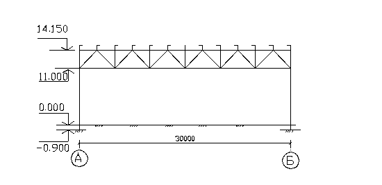 Проектируем одноэтажное каркасное здание длинною L = 60 м, пролетом l = 30 м. Стальной каркас создается колоннами, расставленными шагом B = 6 м, колонны жестко прикрепляются к фундаменту и на верху шарнирно соединяются с ригелем (стропильной ногой). Две колонны и ригель образуют поперечную раму. Пространственная жесткость каркаса обеспечивается путем постановки связи. Связи ставят в плоскости покрытия между фермами и между колоннами. Связи по покрытию располагаются: