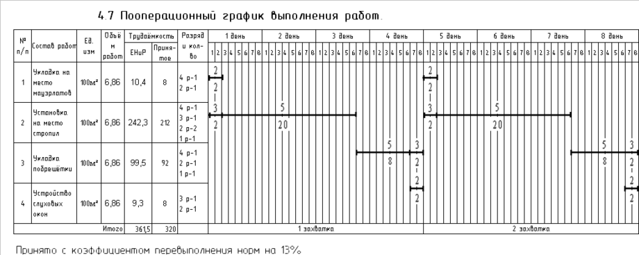 Сначала два плотника (4разр-1 и 2разр-1) производят заготовку и укладку мауэрлатов. В это время оставшиеся рабочие (1разр-1, 2разр-1 и 3разр-1) начинают выполнять работы по установке стропил, закончив укладку мауэрлатов, рабочие (4разр-1 и 2разр-1) присоединяются к рабочим (1разр-1, 2разр-1 и 3разр-1), делают врубку стропильных ног, установку стоек, укладку прогонов они заканчивают вместе. Затем всё звено плотников приступает к укладке брусков обрешётки, уложив некоторые количество брусков обрешётки, уложив некоторые количество трое рабочих (4разр-1, 2разр-1 и 1разр-1) начинают выполнять работы по устройству слуховых окон, а в это время рабочие (3разр-1 и 2 разр-1) делают работы по устройству обрешётки.