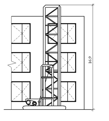 Подъёмник предназначен для подъема строительных материалов при строительстве зданий до 6 и 9 этажей. Подъёмник стационарный, при работе мачта подъёмника крепится к стене специальными креплениями.