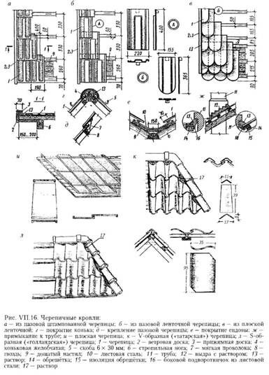 Черепичные кровли. Такой вид кровли, как правило, применяют на крышах с уклоном от 22° до 60°, в зависимости от вида черепицы. Уменьшение угла до 10°—22° для некоторых видов пазовой черепицы допускается в исключительных случаях для шпунтованных сопряжений вдоль скатов и часто требует применения дополнительных мер по гидроизоляции и вентиляции. При уклоне более 30° и особенно более 60° необходимо особое внимание уделять дополнительному креплению черепицы к обрешетке (шурупами и кляммерами). Современная черепица может быть керамической (глиняной) и цементно-песчаной. Как правило, многообразие форм можно свести к трем укрупненным: плоская, волнообразная (в виде одной или двух волн) и желобчатая (рис. VII.16). В нашей стране наиболее распространены три вида: пазовая (штампованная и ленточная) и плоская ленточная. Штампованная имеет пазы и гребни по краям, обеспечивающие водонепроницаемость сопряжении при напуске черепицы на черепицу вдоль одной из боковых сторон и верхней на нижнюю.