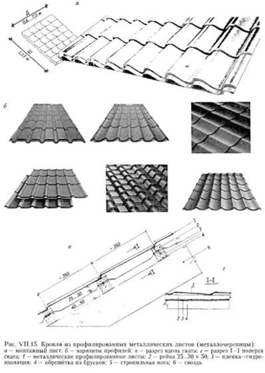 В массовом строительстве наибольшее распространение получили кровли из металлочерепицы (рис. VII.15), которая является разновидностью профилированного стального оцинкованного листа с полимерным покрытием, который подвергается поперечному штампованию для получения рисунка, имитирующего натуральную черепицу. В качестве исходного материала в металлочерепице применяется холоднокатанная сталь толщиной 0,5 мм. После прокатки стальной лист с обеих сторон подвергается горячей оцинковке, при этом его поверхность становится устойчивой к воздействию коррозии, затем наносится слой пластика, выдерживающий воздействие солнечных лучей и колебания температур. На рынке кровельных материалов можно приобрести металлочерепицу до 30 цветов и оттенков. К элитным (дорогим) кровельным материалам относится металлочерепица с каменной крошкой. Масса 1 м 2 кровельного покрытия не превышает 5 кг. Такие кровли легко монтируются как из готовых листов (длина которых может быть от 850 мм до 7850 мм, ширина 1000—1100 м), так и из картин, производимых на специальной установке непосредственно на строительной площадке. Листы, благодаря их профилированности, обладают достаточной жесткостью и обеспечивают надежную защиту для крыш с уклоном от 12° до 90°. Вид профиля может быть разным. Листы могут крепиться как к обрешетке, которая может выполняться из досок, так и к вентилируемой обрешетке, собираемой из металлических элементов. Перфорация на боковых стенках обеспечивает беспрепятственное течение воздуха под металлочерепичными листами и удаление влаги вместе с воздухом через вентиляционные отверстия на коньке и свесе. Листы металлочерепицы монтируют на обрешетке внахлест один над другим и крепят с помощью шурупов-саморезов и уплотнительных прокладок. Шурупы ввинчивают в верхний прогиб волны профиля. На каждом листе, под линией нахлеста вдоль ската, имеется специальная канавка на гребне волны (по всей длине нижнего листа — антикапиллярный паз). Канавка прекращает доступ воде, капиллярно поднимающейся под край листа, и отводит ее к карнизу. Для обрешетки используются доски 25 х 30 х 100 мм или бруски 50x50 мм, которые устанавливаются с определенным интервалом в зависимости от вида металлочерепицы. Под листами металлочерепицы необходимо монтировать гидропароизоляционную пленку, которая укладывается под обрешетку так, чтобы под листами остался воздушный зазор для вентиляции — для предотвращения конденсата на нижней стороне металлочерепицы .
