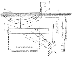 Катодная защита - этот вид защиты предусматривает придание газопроводу отрицательного потенциала относительно окружающей среды посредством помещения к нему источника постоянного тока. Отрицательный полюс источника тока присоединяется к газопроводу, а положительный - к заземлителю (аноду). При этом анодное заземление постепенно разрушается, защищая газопровод. Этот вид защиты применяется от электрохимической коррозии и блуждающих токов. Принципиальная схема катодной установки приведена на рисунке.