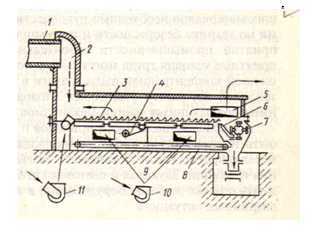 1 – вращающаяся печь; 2 – приемная шахта; 3 – колосниковая решетка; 4 – привод; 5 – окно для сброса избытка отработанного воздуха в атмосферу; 6 – грохот; 7 – молотковая дробилка; 8 – скребковый конвейер; 9 – окна для общего дутья; 10 – вентилятор общего дутья; 11 – вентилятор острого дутья.