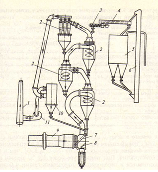 1 – дымовая труба; 2 – циклонные теплообменники; 3 – винтовой питатель; 4 – скребковый конвейер; 5 – расходный бункер сырьевой муки; 6 – ковшовый элеватор; 7 – течка; 8 – переходная головка; 9 – вращающаяся печь; 10 – пылеуловители; 11 – дымосос.