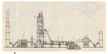 1 – дымосос; 2 – электрофильтр; 3 – циклонный теплообменник; 4 – декарбонизатор;5 – вращающаяся печь 4,5 × 80 м; 6 – установка контроля температуры корпуса; 7 – колосниковый холодильник; 8 – установка для олаждения и увлажнения отходящих печных газов.