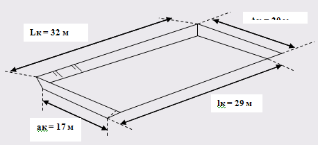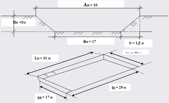 размеры по верху: 20X 32 (Ак = ак + 2b = 17+2*1,5 = 20 м; Lк = bк + 2b = 29+3=32 м)