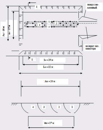Количество боковых проходок = Nбок. = (ак – В1) / В´1 = (17 – 5,6) / 5,2 = 3,0 шт. Вывод: разработку котлована производят 4-мя проходками, экскаватором ЭО4121 (1 лобовая, 3 боковых проходок).