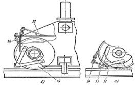 В настоящее время на многих кранах серии КБ установлены захваты тискового типа (рис.6 а). Эти захваты требуют применения для крановых путей специальных стыковых рельсовых накладок. Для работы с обычными железнодорожными накладками применяются полуавтоматические захваты (рис.6 б). Такой захват состоит из сварного корпуса 1 с бобышками 11, которыми он опирается на выступы в центральном проеме ходовой тележки. К корпусу шарнирно прикреплены рычажные губки 8 и 9, причем ось 10 их шарнира выбрана так, чтобы при восприятии отрывающей нагрузки губки не соскакивали с головки рельса. Для фиксации крана в нерабочем состоянии необходимо вставить клин 6 и затянуть болт 2. Для ускорения фиксации крана на путях в настоящее время применяют полуавтоматические захваты без съемных клиньев 6 и болтов 2, но с клиньями 12, подставляемыми под колеса (рис.6 в,г). Противоугонные клинья 12 тележек представляют собой металлический клин с приваренной ручкой. Во время работы крана клин располагается на металлоконструкции тележки, а для остановки крана и закрепления его в нерабочем состоянии клин подводится под колесо 15.
