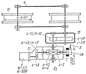 На рис.5 а изображена кинематическая схема механизма передвижения, применяемого для кранов серии КБ с грузовым моментом до 200 т∙м (КБ-60, КБ-100, КБ-160.2,