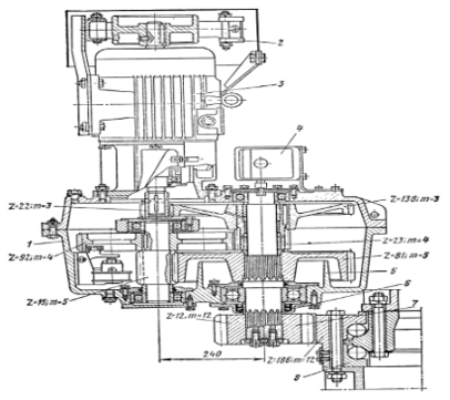 Этот механизм состоит из электродвигателя 3, тормоза 2 и вертикального соосного редуктора 1, смонтированных в один агрегат. Крепление электродвигателя к редуктору на фланце позволяет исключить соединительные муфты и облегчает обслуживание механизма. В редукторе применены цилиндрические шестерни. Нижние шестерни смазываются за счет масляной ванны, а верхние – с помощью плунжерного насоса. Чтобы смазка не вытекала из редуктора вдоль выходного вала, на корпусе редуктора сделано кольцевое ребро 5, поднятое выше уровня масляной ванны, а также манжетные уплотнения 6. На выходном валу редуктора закреплена цевочная (или зубчатая) шестерня 7, которая входит в зацепление с цевочным (зубчатым) венцом опорно-поворотного круга 8. С верхним концом выходного вала редуктора соединен конечный выключатель 4 угла поворота.