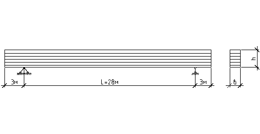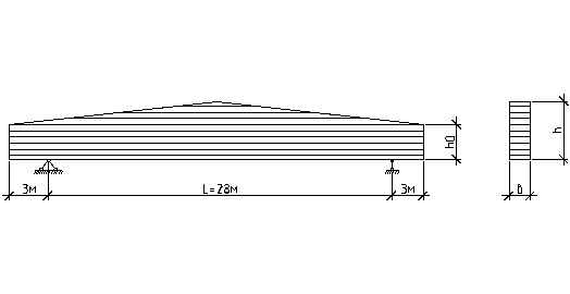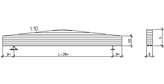 Клееная балка из прямолинейных элементов. Пролет 6…24м, k см = 4…6, k м = 0…1. Для пролета L=28м принимаем k см = 6, k м =1.