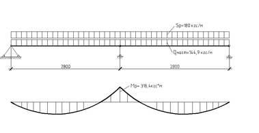 Расчетную схему принимаем в виде 2-х пролетной балки с пролетом равным 2,8м.